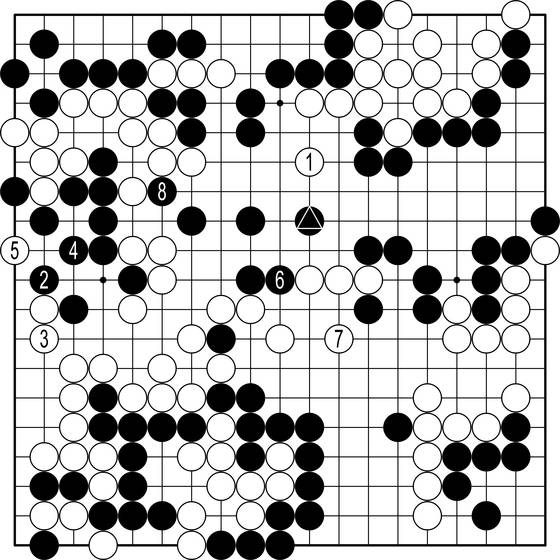 장면⑩=종반에 미세하게 얽히면 신진서 9단은 대개 이긴다. 그런데 결론부터 말하면 오늘은 졌다. 딩하오 9단은 흑▲로 뛰며 깊은 함정을 팠다. 신진서의 수준이라면 함정이랄 것도 없다. 한눈에 보이는 그런 노림이니까. 한데 신진서는 백1로 뛰었다. 착각일까? 착각이다. 천지가 뒤바뀌는 해일이 다가오는데 신진서는 백1로 작은 끝내기를 했다. 이때부터는 딩하오의 시간이다. 흑2, 4로 두어 죽은 돌의 수를 늘리고 6을 선수하여 안전장치를 한 다음 드디어 소원하던 흑8을 두었다.