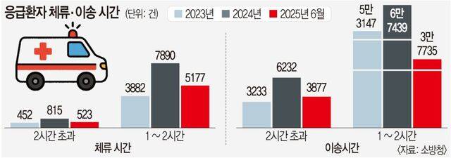 구급대원이 현장에 머무는 ‘체류 시간’도 급증했다. 이송 병원을 찾지 못해 시간을 허비한 탓이다. 체류 시간이 2시간을 넘긴 경우는 지난해 815건으로 2023년 452건보다 1.8배 증가했다. 1~2시간은 전년 3882건 대비 배 이상 늘어난 7890건이었다. 김성현 전국공무원노조 서울소방지부 구급국장은 “응급실을 찾는 전화를 오래 돌릴수록 환자를 이송할 병원의 거리도 멀어진다”고 말했다.