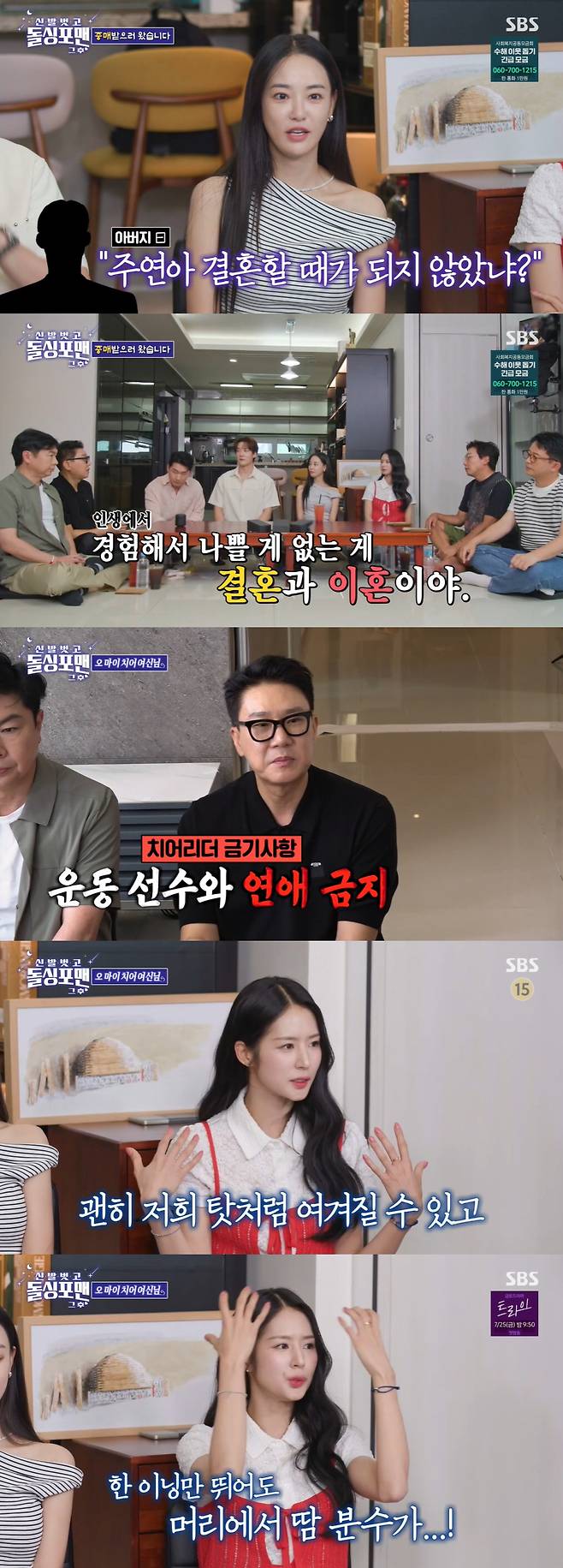 이주연은 "아버지 때문에 결혼을 망설인다고 들었다"라는 말에, "꼭 아빠 때문만은 아니다. 아버지가 몇 년 전까지만 해도 '결혼할 때가 되지 않았냐'라고 했는데, 최근에는 '이혼할 거면 하지 말라'라고 하신다"라고 털어놨다. 이를 듣던 이상민, 탁재훈 등 '돌싱포맨' 멤버들은 크게 당황했고, 이상민은 "경험해서 나쁠 게 없는 게 결혼과 이혼"이라고 짚었다. 탁재훈은 "그런 경험에 재미 들린거냐"라고 받아쳐 웃음을 안겼다.