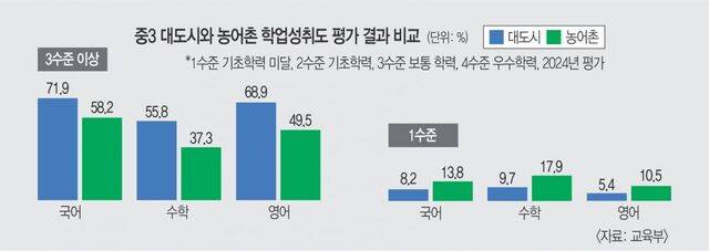 중학생 국어 1수준 비율은 대도시 8.2%, 농어촌 13.8%였다. 수학은 대도시 9.7%, 농어촌 17.9%였다. 농어촌 학생 다섯 명 한 명꼴로 ‘수포자’(수학포기자)라는 뜻이다. 영어의 경우 농어촌이 10.5%로 대도시 5.5%의 2배에 달했다.