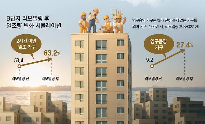 리모델링 조합이 한정된 땅에 건물을 더 높고 빽빽하게 짓겠다고 나서면서 리모델링 후 주거환경이 더 나빠지는 사례도 나온다. 송파구 가락동에 있는 B단지의 경우 계획대로 리모델링을 할 경우 낮에도 햇볕이 들어오지 않는 가구(영구음영)가 기존 190채에서 643채로 3.38배 늘어난다. 기존 2000채를 2300채로 규모를 늘린다는 점을 고려하면 영구음영 비중은 9.2%에서 27.4%로 약 3배 증가한다. 2시간 연속 일조가 불가능해 일조권을 침해받는다고 볼 수 있는 가구는 전체 규모의 53.4%에서 63.2%로 늘어난다. 이처럼 주거환경이 열악한 가구는 대부분 리모델링 조합원이 아닌 일반에 분양될 전망이다.