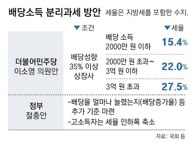 22일 관계 부처에 따르면 여당 내에서 배당소득 분리과세를 반대하는 의견이 다수인 상황이다. 정부 관계자는 “여당에서 다수 의원이 배당소득 분리과세를 반대하고 있다”며 “더불어민주당 이소영 의원 안은 배당 촉진이라는 파급 효과에 중점을 두고 있지만 그 자체만 보면 부자들이 혜택을 받기 때문”이라고 말했다.