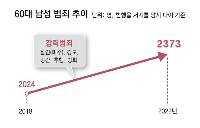 60대 이상 인구는 2015년 약 460만 명에서 2022년 약 700만 명으로 52.2% 증가했다. 하지만 같은 기간 수형자 수는 2배 가까이로 늘었다. 성범죄도 예외는 아니다. 경찰 조사 결과 2018년 1756명이던 60대 남성 성범죄자는 2022년 2042명으로 증가했다.