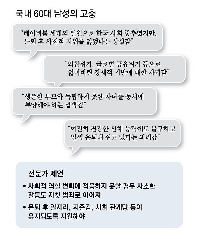 하지만 이 같은 60대의 상실감을 범죄와 관련된 ‘위험 신호’로만 받아들여선 안 된다고 전문가들은 강조한다. 임명호 단국대 심리치료학과 교수는 “60대 대다수는 상실감을 겪어도 자기 관리를 통해 심리적 건강을 지켜내고 일자리를 찾는 등 어떻게든 가족과 사회에 기여하려 한다”며 “일부의 문제를 전체로 보지 말아야 한다”고 밝혔다.