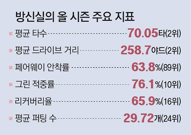 방신실의 자신감은 단순한 느낌이 아니다. 신장 173cm에 팔도 긴 방신실은 큰 스윙으로 루키 시절부터 ‘장타자’로 이름을 날렸다. KLPGA투어에 데뷔했던 2023년 그는 262.5야드의 평균 드라이브 비거리로 장타 1위를 했다. 올 시즌에도 평균 드라이브 비거리 258.7야드로 이동은(260.3야드)에 이어 2위다. 방신실은 “방향이 조금만 벗어나면 ‘OB(아웃오브바운즈·공이 경기 불가능 지역으로 벗어나는 것)’가 되는 국내와 달리 미국은 공이 다른 홀로 넘어가더라도 거기서 두 번째 샷을 치면 된다”며 “미국에선 OB에 대한 부담감이 없이 시원한 스윙을 할 수 있다고 느꼈다”고 말했다.