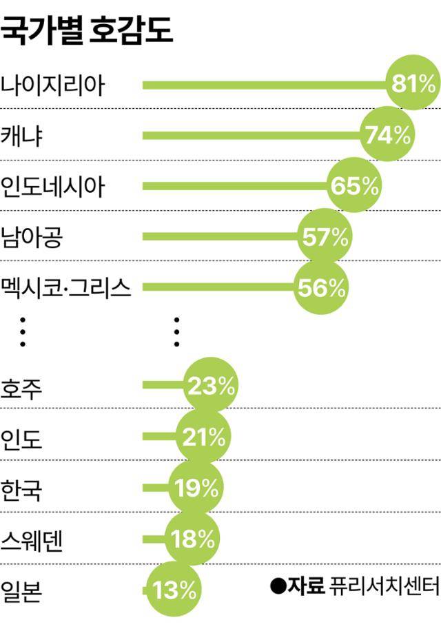 그러나 한국은 예외였다. 24개국 중 한국의 대중 호감도는 19%로, 일본(13%) 스웨덴(18%)에 이어 최하위권이었다. 반면 미국에 대한 호감도는 61%(4위)로 일본(55%)보다 오히려 높았다.