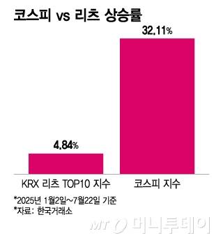 22일 한국거래소에 따르면, 올해 유가증권시장에 상장된 리츠 중 시가총액 상위 10개 종목을 모은 KRX 리츠 TOP10 지수는 올해 들어(1월2일~7월22일) 4.84% 상승했다. 같은 기간 코스피 지수가 32.11% 오른 것과 비교하면 크게 뒤처진 수치다.