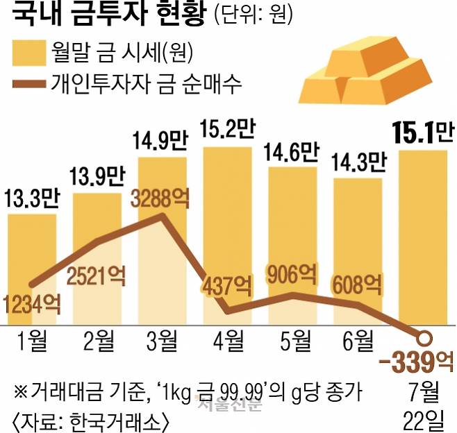 22일 한국거래소(KRX)에 따르면 개인투자자들은 지난 1일부터 이날까지 KRX 금시장에서 339억원 상당의 금을 순매도했다. KRX 금시장에서 개인투자자들은 지난해 3월 이후 15개월 연속 순매수 행진을 이어 왔는데 이러한 흐름이 끊긴 것이다. 지난해 4월부터 올해 6월까지 개인이 순매수한 금은 1조 4660억원에 이른다. 이에 힘입어 KRX 금시장은 올해 상반기 거래량이 37.3t으로 사상 최고치를 기록하기도 했다.