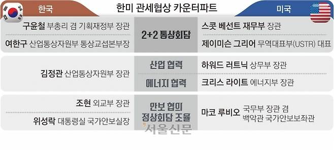 구윤철 부총리 겸 기획재정부 장관은 22일 정부서울청사에서 대외경제장관회의를 주재한 뒤 “저와 여한구 산업통상자원부 통상교섭본부장이 미국 스콧 베선트 재무부 장관 및 제이미슨 그리어 무역대표부(USTR) 대표와 ‘2+2’로 회의하기로 했다”며 “아주 촘촘한 전략을 마련할 계획”이라고 밝혔다. 한국에선 산업부 장관 대신 여 본부장이 출격한다. 구 부총리는 “미국 측 요청”이라고 설명했다. 양국 ‘통상 부문’ 협상 카운터파트의 격을 일치시킨 것이다. 여 본부장은 미국 정부·의회 관계자들과의 만남을 위해 이날 출국했고, 구 부총리는 24일 방미길에 오른다.