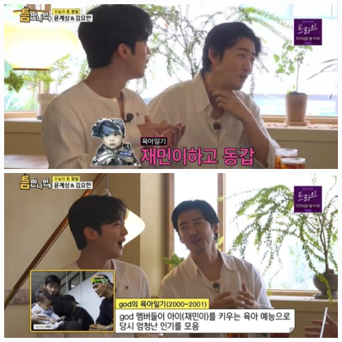 윤계상은 'god의 육아일기' 속 재민이가 벌써 26세가 됐다고 언급했고, 유재석은 "지금으로 치면 BTS가 육아 예능을 한 것"이라며 god의 전성기를 떠올렸다.