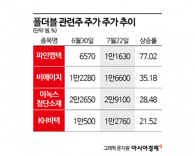 23일 한국거래소에 따르면 파인엠텍은 전날 1만1630원에 거래를 마쳤다. 지난달 말 대비 77.02% 상승이다. 같은 기간 비에이치는 35.18% 뛰었으며 이녹스첨단소재와 KH바텍도 각각 28.48%, 21.52% 오르는 등 폴더블 관련주들이 높은 상승률을 기록하고 있다.