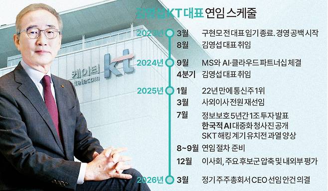 22일 업계에 따르면 현재 KT를 이끌고 있는 김영섭 대표의 임기는 2026년 3월 정기 주주총회까지다. 구현모 전 대표의 연임 실패로 5개월의 경영 공백 끝에 지난 2023년 8월 운전대를 잡았다.