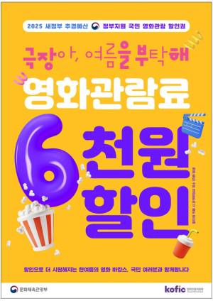 문화체육관광부(장관 유인촌)는 영화진흥위원회(위원장 한상준)와 함께 오는 7월 25일 오전 10시부터 영화관 입장권 6000원 할인권 총 450만 장을 배포한다고 23일 밝혔다. 이번 사업은 내수 진작을 통한 민생 회복과 영화산업 활성화를 위해 확보한 새 정부 2025년 2차 추가경정예산 271억 원으로 추진하는 사업이다.