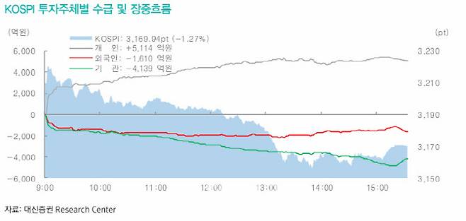 이 연구원은 “8거래일 연속 이어지던 외국인 매수가 멈추자 고점에서의 힘의 균형이 무너졌고, 단숨에 3150대까지 밀렸으나 3150~3220 박스권 하단에서 지지력을 확인하며 3169포인트로 장을 마쳤다”며 “반도체, 원자력, 전력기기, 방산 등 주도주 차익실현이 강하게 나타나는 등 순환매 장세”라고 말했다.