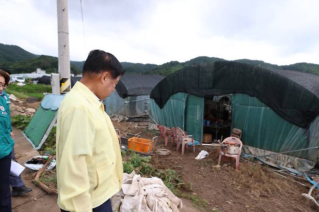 이에 따라 고성군은 지난 20일 읍면 전직원 및 행정지도 담당 실과장이 출근해 철저한 피해조사 및 즉각적인 복구 작업을 실시했으며 21일에는 이상근 군수가 피해 현장을 직접 방문해 복구 진행 상황을 점검했다.