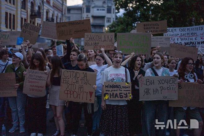 [키이우=AP/뉴시스] 22일(현지 시간) 우크라이나 키이우에서 반부패 기관의 독립성을 박탈하는 정부의 법안 통과에 항의하는 시위에 참여한 사람들이 "러시아처럼 될 것인가" "우리의 미래를 훔치지 말라" 등의 내용이 적힌 손팻말을 들고, 구호를 외치고 있다. 2025.07.23.
