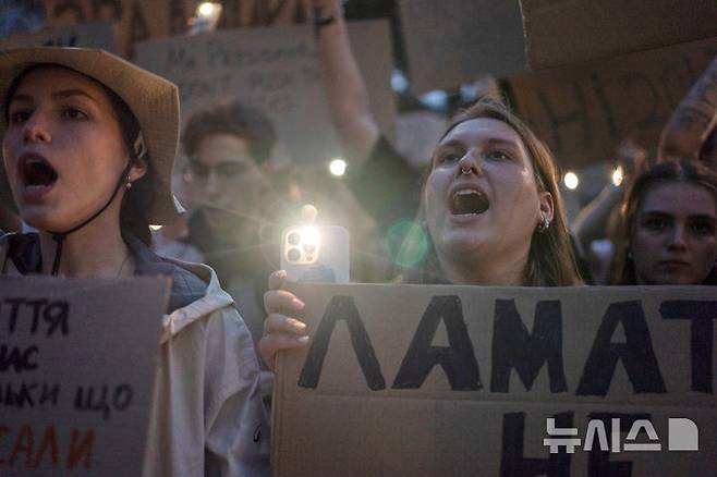 [키이우=AP/뉴시스] 22일(현지 시간) 우크라이나 키이우에서 반부패 기관의 독립성을 박탈하는 정부의 법안 통과에 항의하는 시위에 참여한 여성들이 손팻말을 들고, 구호를 외치고 있다. 2025.07.23.