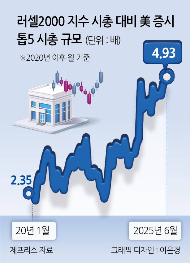 10년 전인 2015년 6월 기준으로 톱5 종목의 시총은 러셀2000 시총의 0.96배로, 중·소형주 대표 지수의 시총이 더 컸다. 하지만 5년이 지난 2020년 6월 기준으로 해당 수치가 3배로 뛰어올랐고, AI 랠리에 가속도가 붙은 1년 전(2024년 6월)엔 4.83배까지 치솟으며 고점을 찍었다. 이후 ‘AI 버블(거품)론’의 여파로 조정 장세가 펼쳐진 결과 작년 11월엔 4.18배까지 내려섰지만, 올해 다시 속도가 붙은 AI 랠리에 수치가 5배 코앞까지 다다르며 전고점을 뛰어넘었다.