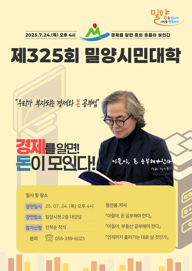 밀양시는 오는 24일 오후 4시 시청 대강당에서 열리는 제325회 밀양시민대학 강연에 정선용 작가를 초청해 ‘우리가 부자 되는 경제와 돈 공부법’이라는 주제로 특별 강연을 개최한다.