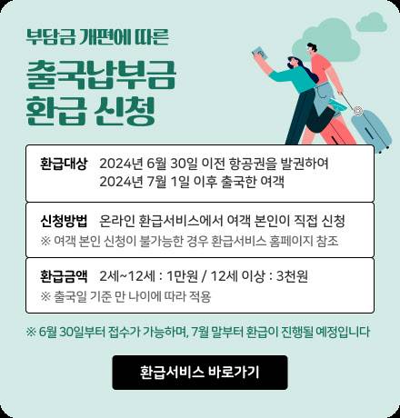 부담금 제도 개편 통해 납부금 인하 및 면제 확대 지난해 6월 30일 이전 발권, 7월 이후 출국자 대상 2세~12세 미만 1만원, 12세 이상은 3000원 환급