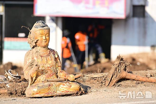 [산청=뉴시스] 차용현 기자 = 23일 오전 경남 산청군 외송리 일원에서 발생한 실종자 수색작업이 한창 진행중이다. 이곳에서는 기록적인폭우로 암자 하나가 산사태에 휩쓸려 유실되면서 80대 스님 한 명이 실종됐다. 2025.07.23.con@newsis.com