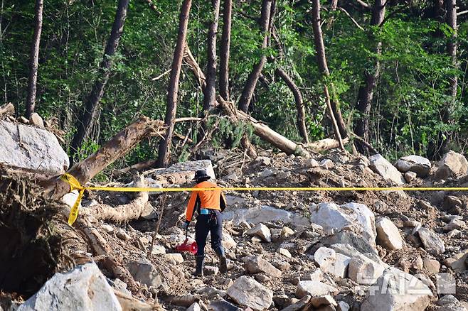 [산청=뉴시스] 차용현 기자 = 23일 오전 경남 산청군 외송리 일원에서 발생한 실종자 수색작업이 한창 진행중이다. 이곳에서는 기록적인폭우로 암자 하나가 산사태에 휩쓸려 유실되면서 80대 스님 한 명이 실종됐다. 2025.07.23.con@newsis.com