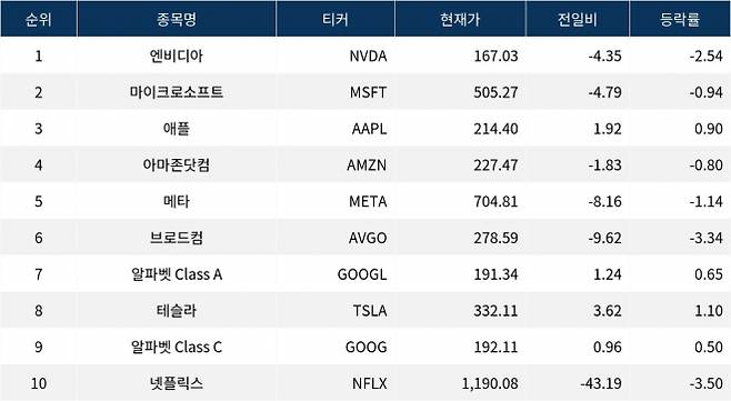 엔비디아(NVDA)는 전일 대비 2.54% 하락하며 167.03달러에 거래를 마쳤다. 마이크로소프트(MSFT)는 0.94% 하락하여 보합세를 나타내며 505.27달러에 장을 마감했다. 반면, 애플(AAPL)은 소폭 상승하여 0.90%의 등락률로 214.40달러에 거래를 종료했다.