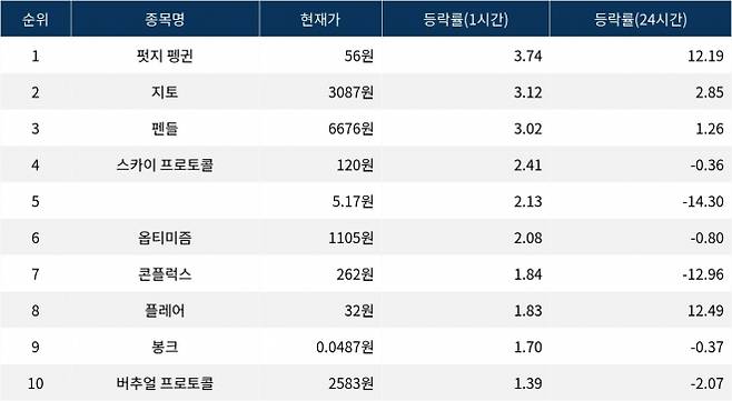 [서울데이터랩]펏지 펭귄 지토 펜들 상승률 상위 종목 소개
