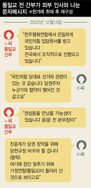 2022년 12월14일 밤 9시께 한 통일교 간부 ㄴ씨가 교단 외부 인사 ㄷ씨에게 "UPF(천주평화연합)에서 은밀하게 국민의힘 입당 원서를 받고 있습니다. 전국에서 조직적으로 진행되고 있습니다"라고 하자, ㄷ씨는 "내년(2023년) 3월 국민의힘 당대표 선거와 관련이 있는 것 같습니다. 당권주자 누군가와 협약이 맺어진 것 같고요"라고 답했다.