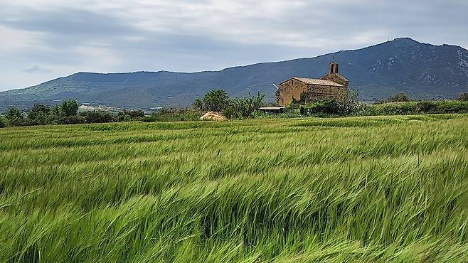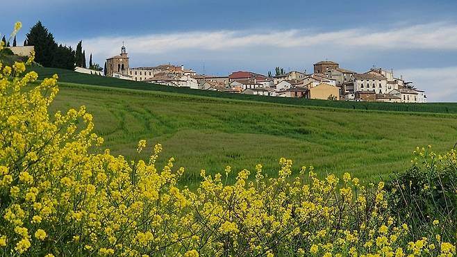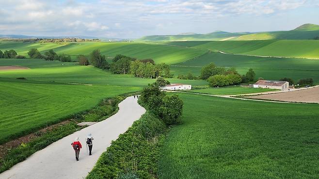 오늘로 종일 걷기는 5일째다. 팜플로나까지는 피레네 자락이라 숲길과 계곡길도 있더니 팜플로나부터는 녹색 들판 경연대회를 하고 있다. 어쩌면 신(神)이 실수로 어딘가에서 물감통을 떨어트린 게 분명하다. 다른 색은 다 잃어버리고 녹색과 쓰다만 노란색만 남았을 거야. 연녹색, 진녹색, 때론 노란 유채를 흩뿌려가며 너른 캔버스에 구획구획 녹색 칠을 해놓았다.