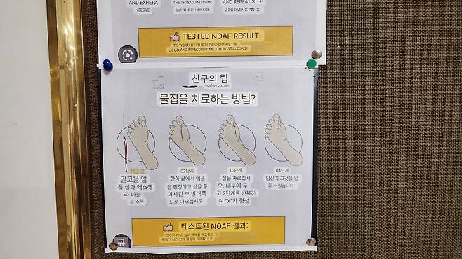 | ▲ 산토 도밍고 데 칼사다 숙소에 걸려있던 물집을 치료하는 방법. 놀랍게도 한글 설명이다. |