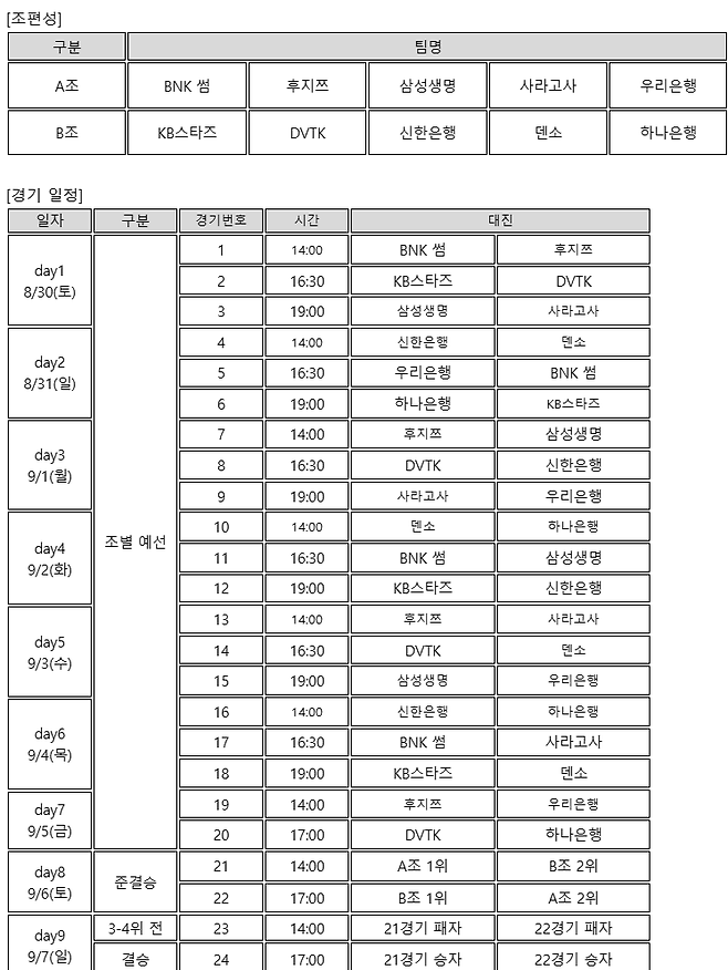 개막전은 8월 30일(토) 14시 BNK와 후지쯔의 맞대결로 확정됐다.