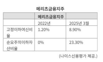 이어 "해당 기업대출에 대해 홈플러스의 주요 점포를 담보로 한 신탁의 1종수익권을 보유하고 있고, 해당 부동산의 담보가치를 감안할 때 궁금적인 회수가능성에 미치는 영향은 제한적일 것으로 보인다"면서 "다만, 담보권 실행과정에서 나타날 수 있는 제약여건 등 일부 불확실성도 상존하고 있어 해당 대출건의 회수상황에 대한 모니터링이 필요하다"고 전했다. 여기에 나신평은 메리츠금융지주는 자산건전성 저하 속에 부동산 익스포저는 부담요인에 자회사 지원까지 더하고 있다고 덧붙였다.