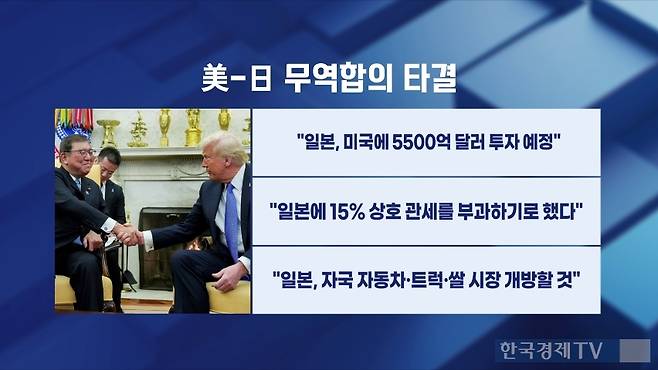 - 미국과 일본의 무역협상 타결로 상호관세는 15%로 부과되며, 일본은 자동차, 트럭, 쌀 시장을 개방 예정임.
