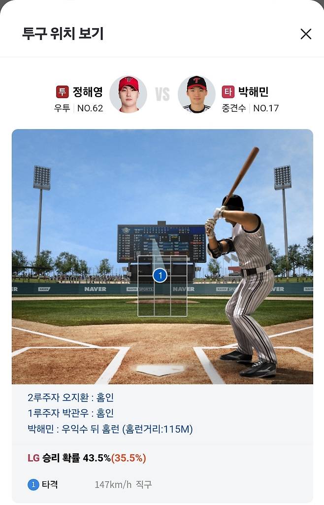 타석엔 박해민. 이날 경기 전까지 올 시즌 홈런은 딱 1개만 때려낼 정도로 일발장타 능력은 없었던 박해민이어서였을까. 정해영은 초구로 시속 147km짜리 포심패스트볼을 한 가운데에 집어넣었다. 박해민은 이를 놓치지 않았다. 벼락같이 잡아당긴 타구는 115m를 날아가 KIA챔피언스필드 우측담장을 넘기는 동점 3점 홈런으로 연결됐다. 8회에만 6점을 내주며 경기를 내주는 듯 했던 LG는 다시 경기를 원점으로 돌렸다.