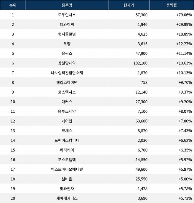 6위 삼천당제약(000250)은 현재가 182,100원으로 10.63% 상승 중이다. 7위 나노실리칸첨단소재(286750)는 현재가 1,870원으로 10.13% 상승 중이다. 8위 웰킵스하이텍(043590)은 현재가 758원으로 9.70% 상승 중이다. 9위 코스텍시스(355150)는 현재가 12,140원으로 9.37% 상승 중이다. 10위 매커스(093520)는 현재가 27,300원으로 9.20% 상승 중이다.