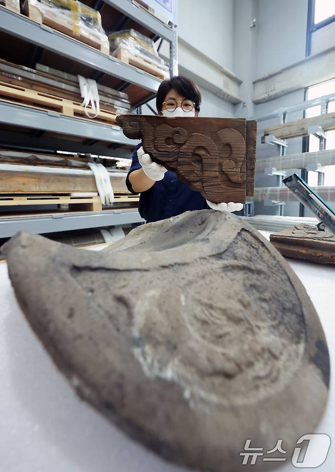 (파주=뉴스1) 황기선 기자 = 23일 오전 경기 파주시 전통건축수리기술진흥재단 수장고에서 관계자가 관월당 해체 부재를 공개하고 있다.