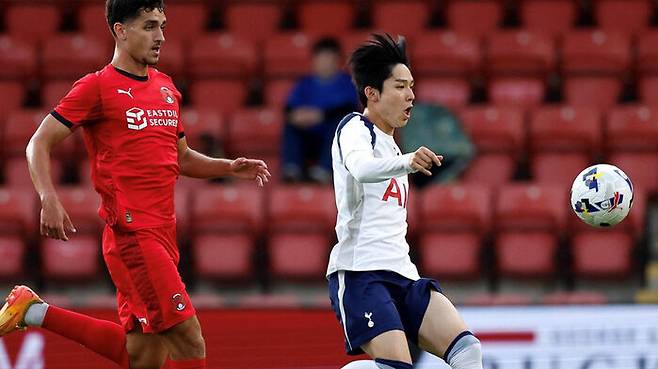 ▲ 토트넘 유니폼을 입고 U-21팀 경기에 출전한 양민혁(오른쪽)