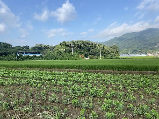 | ▲ 임실 오수면 한암리 고향 산자락 아래 자리한 김진성 작가의 공방(사진 중앙 왼쪽의 하늘색 지붕 건물) |
