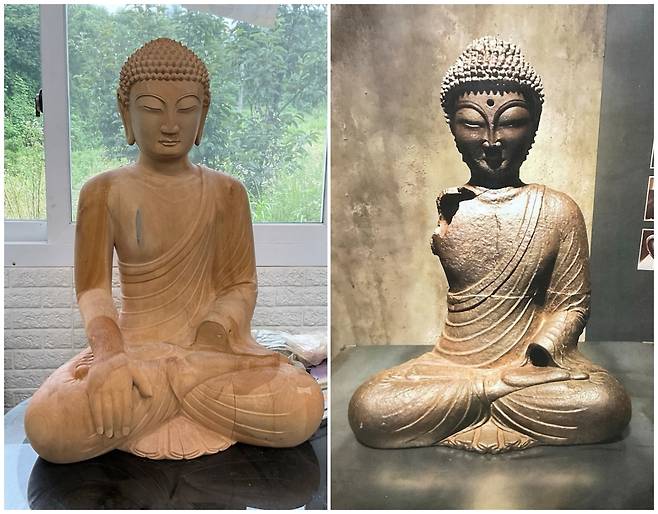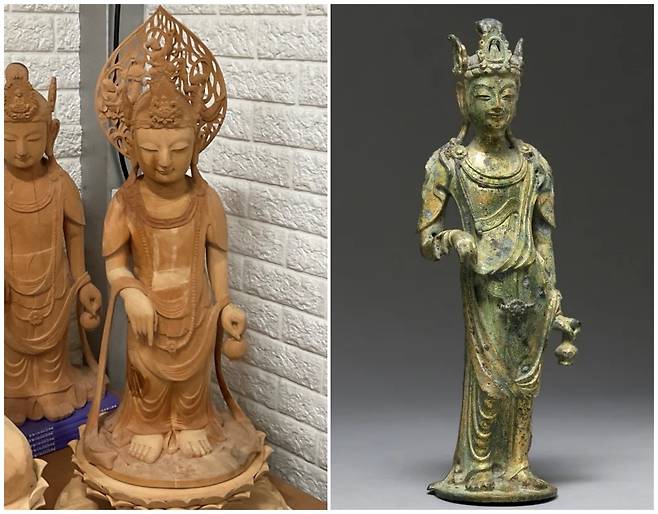 | ▲ [왼쪽] 백제 관음보살입상 복원 목불(38×38×79, 단위 cm), [오른쪽] 백제 금동관음보살입상 사진, 문화유산회복재단 제공 사진 인용) |