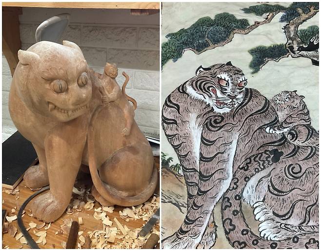 | ▲ [왼쪽] 까치호랑이 목각 (35×23×40, 단위 cm), [오른쪽] 김진성 목조각 공방의 자료 사진 인용 |