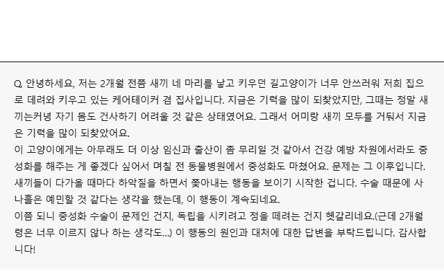 그런데 사연 속에는 한 가지 변수가 있네요. 어미 고양이가 중성화를 한 지 얼마 되지 않았다는 겁니다. 이로 인한 정서적, 신체적 스트레스로 혼자 쉬고 싶을 수 있습니다. 이러한 모습은 대게 1주일 정도 지속될 수 있어 보입니다.