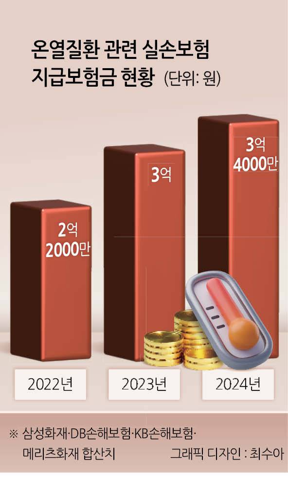 23일 보험업계에 따르면 국내 주요 4개(삼성화재·DB손해보험·KB손해보험·메리츠화재) 손해보험사의 온열질환(열사병·일사병 등) 관련 실손보험 지급보험금은 지난해 연간 3억4000만원으로 집계됐다. 이는 2년 전(2억2000만원)보다 54.5% 증가한 수치다.
