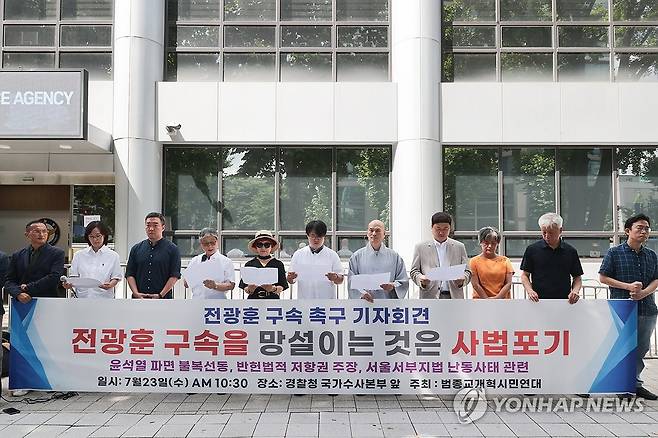 (서울=연합뉴스) 류효림 기자 = 개신교, 불교, 원불교, 천도교, 천주교 단체로 구성된 범종교개혁시민연대 회원들이 23일 서울 서대문구 국가수사본부 앞에서 기자회견을 열고 전광훈 목사 구속을 촉구하고 있다. 2025.7.23