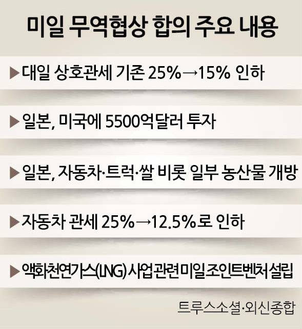 일본은 미국과의 협상에서 알래스카 LNG 사업을 비롯해 거액을 미국에 투자하고 자동차와 농산물도 개방하는 조건으로 기존 25%의 관세율을 15%로 낮춘 셈이다.