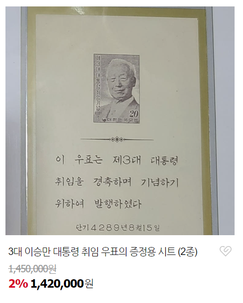 액면가 5원이었던 제3대 대통령이었던 이승만 대통령 취임 기념 증정용 시트를 142만원에 판매하는 온라인 쇼핑몰도 찾아 볼 수 있습니다.