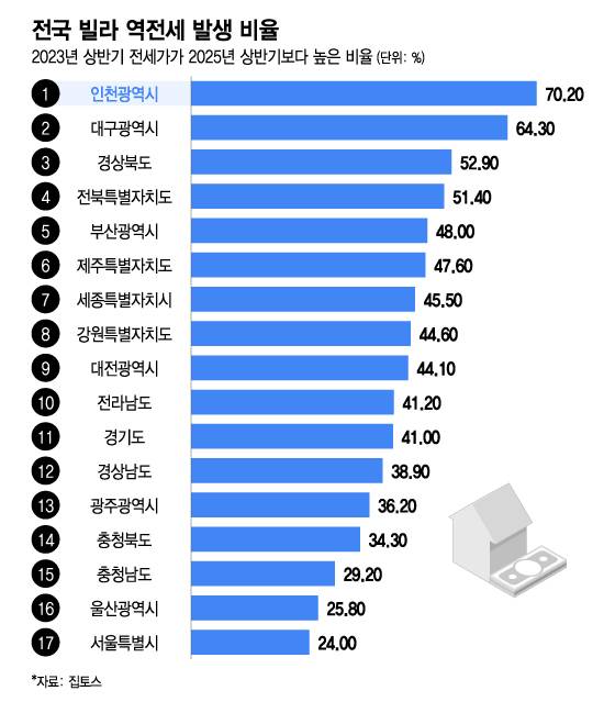 지역별 평균 전세가 변동률을 살펴보면, 대구는 -9.7%, 인천 -7.0%, 세종 -5.2%, 대전 -4.3%, 부산 -3.5%로 하락폭이 컸다. 반면 서울은 같은 기간 빌라 전세가가 2.4% 상승했고, 경기도는 0.5% 오르며 상대적으로 안정적인 모습을 보였으나, 서울 아파트 전세가가 평균 11.7% 급등한 것과 비교하면 사실상 정체 수준에 머물렀다.