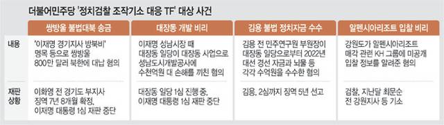 TF 단장인 한준호 민주당 최고위원은 이날 2차 TF 회의에서 “검찰이 벌인 억지수사 조작기소를 바로잡으려 한다”며 “민주당은 검찰의 만행을 발본색원해서 검찰이 찬탈한 수사권을 국민에게 돌려드리겠다”고 밝혔다. 앞서 TF는 ‘쌍방울 불법 대북 송금’ ‘대장동 개발 비리’ ‘김용 전 민주연구원 부원장의 불법 정치자금 수수’ ‘알펜시아 리조트 입찰 비리’ 등 총 네 사건을 ‘조작’이라 규정한 바 있다. 쌍방울 사건과 대장동 사건은 이 대통령이 기소된 사건이고, 김 전 부원장은 이 대통령의 최측근 인사다. 이 대통령 재판은 중단됐지만 네 사건 모두 관련자들 재판이 진행 중이거나 종결된 상태다. 한 최고위원은 이들 사건에 참여했던 변호사 4명(신알찬·백종덕·오동현·김현철)의 합류를 알리며 “검찰 기소가 조작이고 억지라는 주장을 밝혀줄 분들”이라고 소개했다. 신 변호사는 이날 회의에서 김 전 부원장의 혐의와 관련해 2심 법원이 증거로 인정하지 않은 그의 행적 자료(구글 타임라인)에 대한 주장을 반복하며 검찰이 조작 기소를 했다고 주장했다. 오 변호사는 이 대통령의 외곽조직으로 통하는 더민주혁신회의 경기지역 상임 대표이며, 백 변호사는 이 대통령이 경기지사 시절 변호인을 맡은 바 있다.