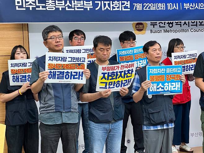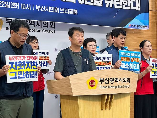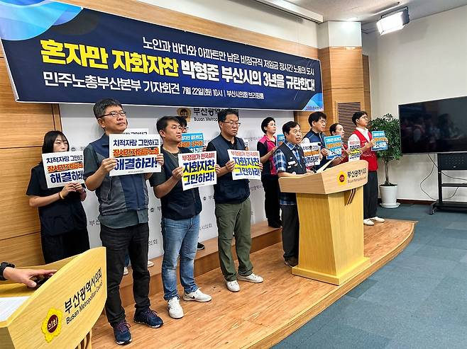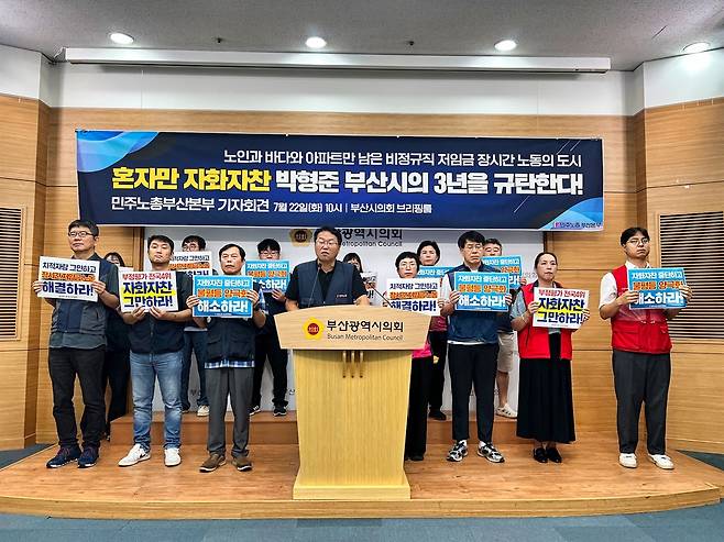 민주노총 부산지역본부가 22일 오전 10시 부산시의회 브리핑룸에서 기자회견을 열고 박형준 부산시장의 3년 시정을 비판했다.