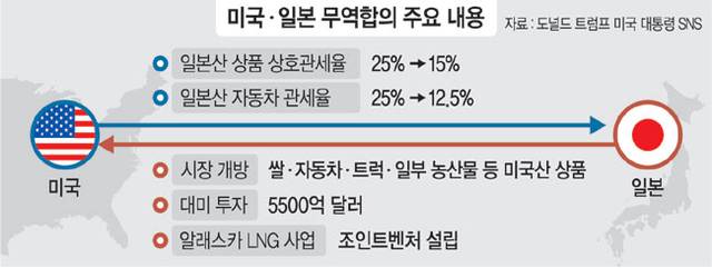 일본이 쌀값 폭등에도 꼭 닫아뒀던 쌀 시장을 미국에 개방하고 애초 통보받은 데서 10%포인트 낮은 15%의 관세를 부과받으면서 일본과 같은 25%의 관세를 통보받은 한국의 부담이 커지게 됐다. 특히 일본이 쌀을 내놓은 대신 자동차 품목 관세를 낮추면서 미국 등 세계 시장에서 자동차 시장 우위를 지키려는 의도를 드러낸 것이어서 미국과 협상에 나서는 한국에 더욱 부담이 될 전망이다.